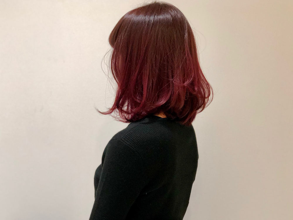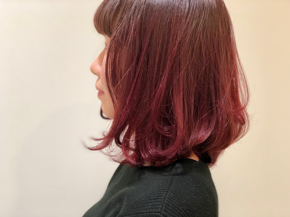 根元には柔らかいボルドーをいれ、毛先にむかってアクセントカラーを入れることで強くなりがちな赤系のカラーをポイントで楽しませるデザインにしてみました✧