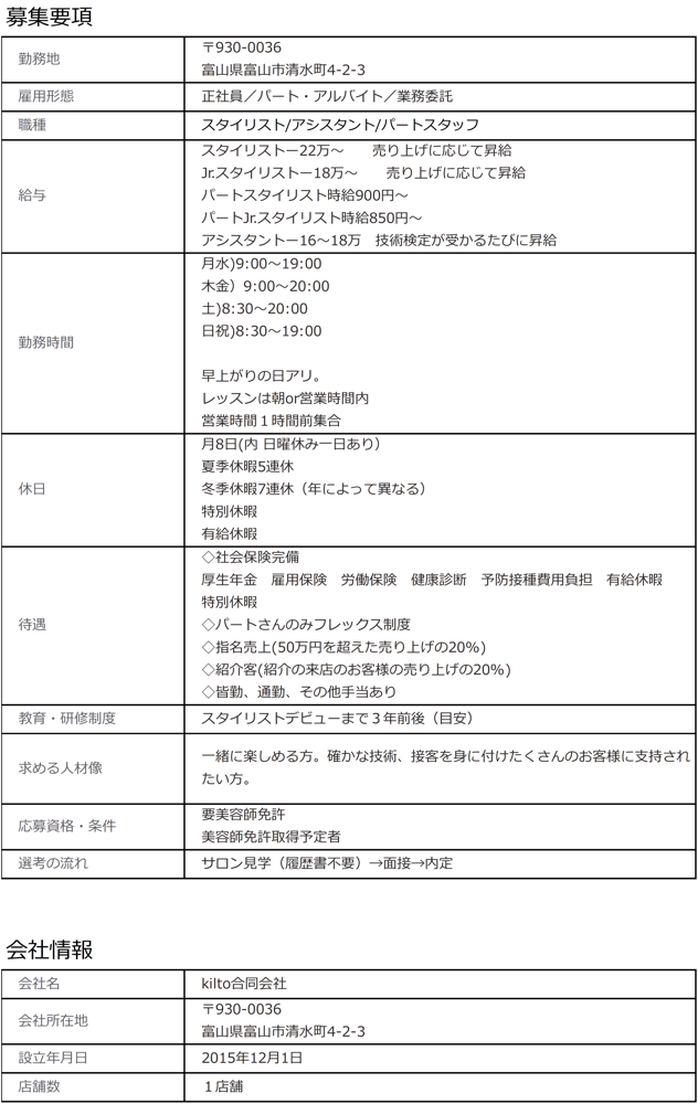 (もちろん、新卒、中途、パートすべてウェルカムです。要美容師免許です。)