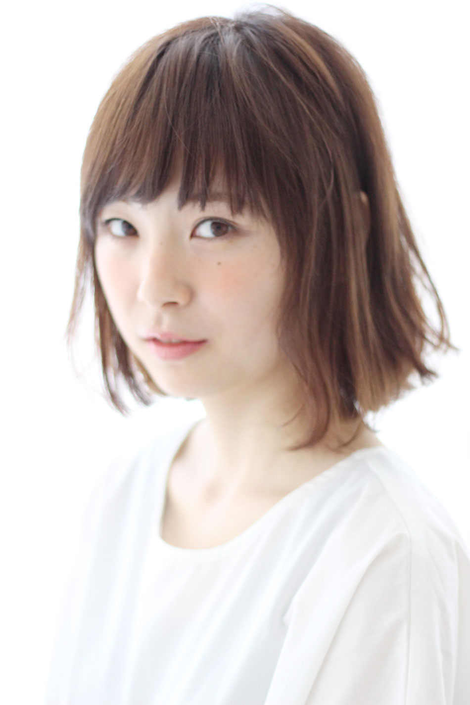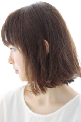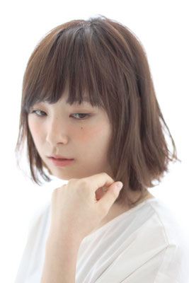 ワンレングスのボブ。バングは降ろ流しにしやすくプチアシメ。軽めの前髪にし、抜け感の演出。全体に毛先中心に大きめのくせ毛風パーマをエアーウェーブでかけました。カラーはミントベージュで柔らかさを強調。